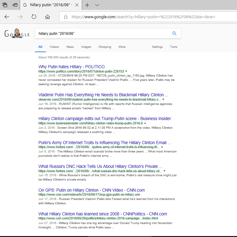 June 1 – July 15, 2016: mixed results. The liberal media tends to like Putin and to think that Putin would prefer Hillary. From the first page: