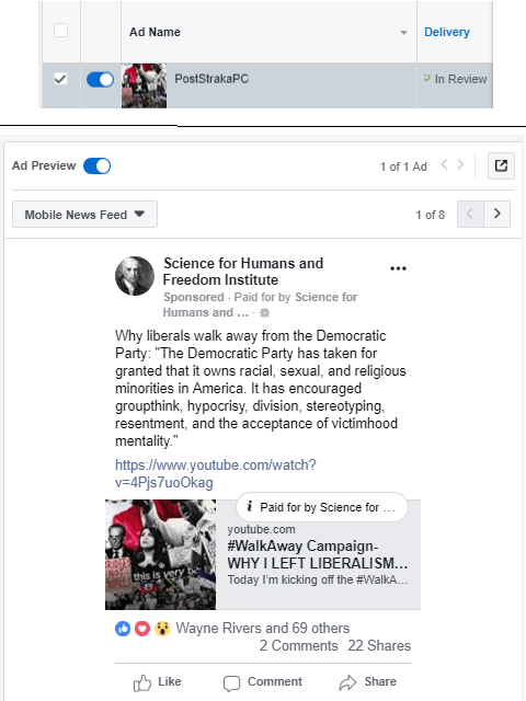 Facebook was keeping the post in review for more than two days until I disabled it. Note that Facebook had previously vetted my page for the Science for Humans and Freedom Institute, assuring that it’s run by an American citizen and resident, and qualified it for what it defines as political ads.