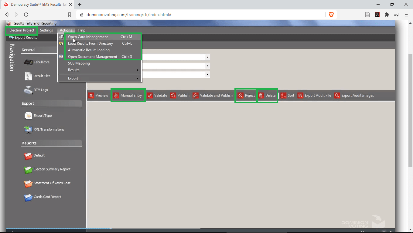 Various suspicious options (Election Project, Manual Entry, Reject, Delete, Open Document Management etc.) are highlighted.