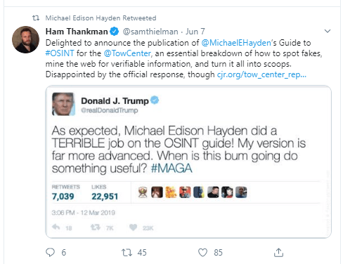 To be precise about their work distribution: Michael E. Hayden was listed as the author under the CJR article and thanked Sam Thielman for contribution. When promoting the article on Twitter, Sam Thielman tweeted the fake screenshot, and Michael E. Hayden retweeted it. Sam Thielman was one of the most active pushers of the Russia hoax.