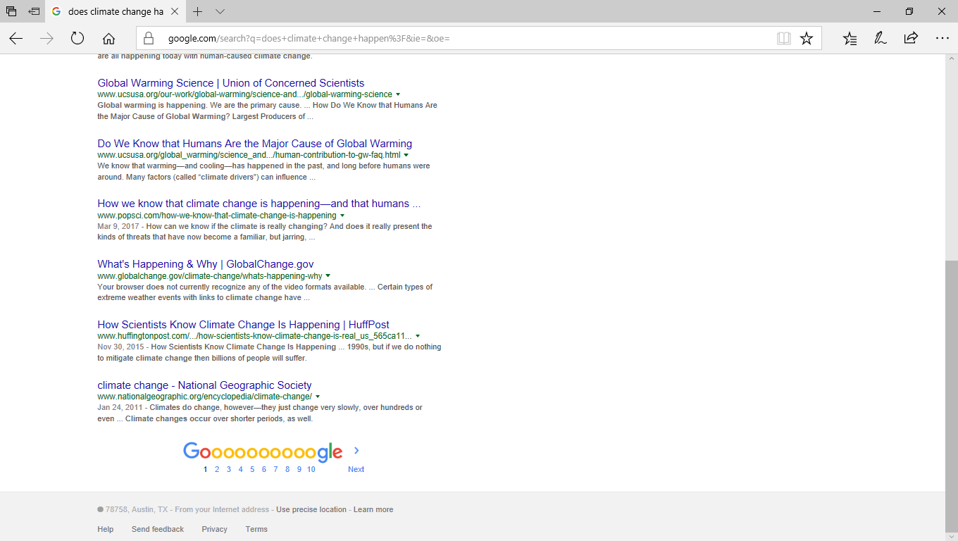 Because “the resistance” keeps likening climate realists to Holocaust deniers, one might be curious as to whether climate skeptics sometimes get prominent positions, too. No, that does not happen. The searches does climate change exist and does climate change happen, performed on 2017-09-15 (so they cannot be directly compared to Google searches in Dec 2016), return exclusively climate alarmist websites on the first page, except that the former one returns a page with arguments from both sides from procon.org.