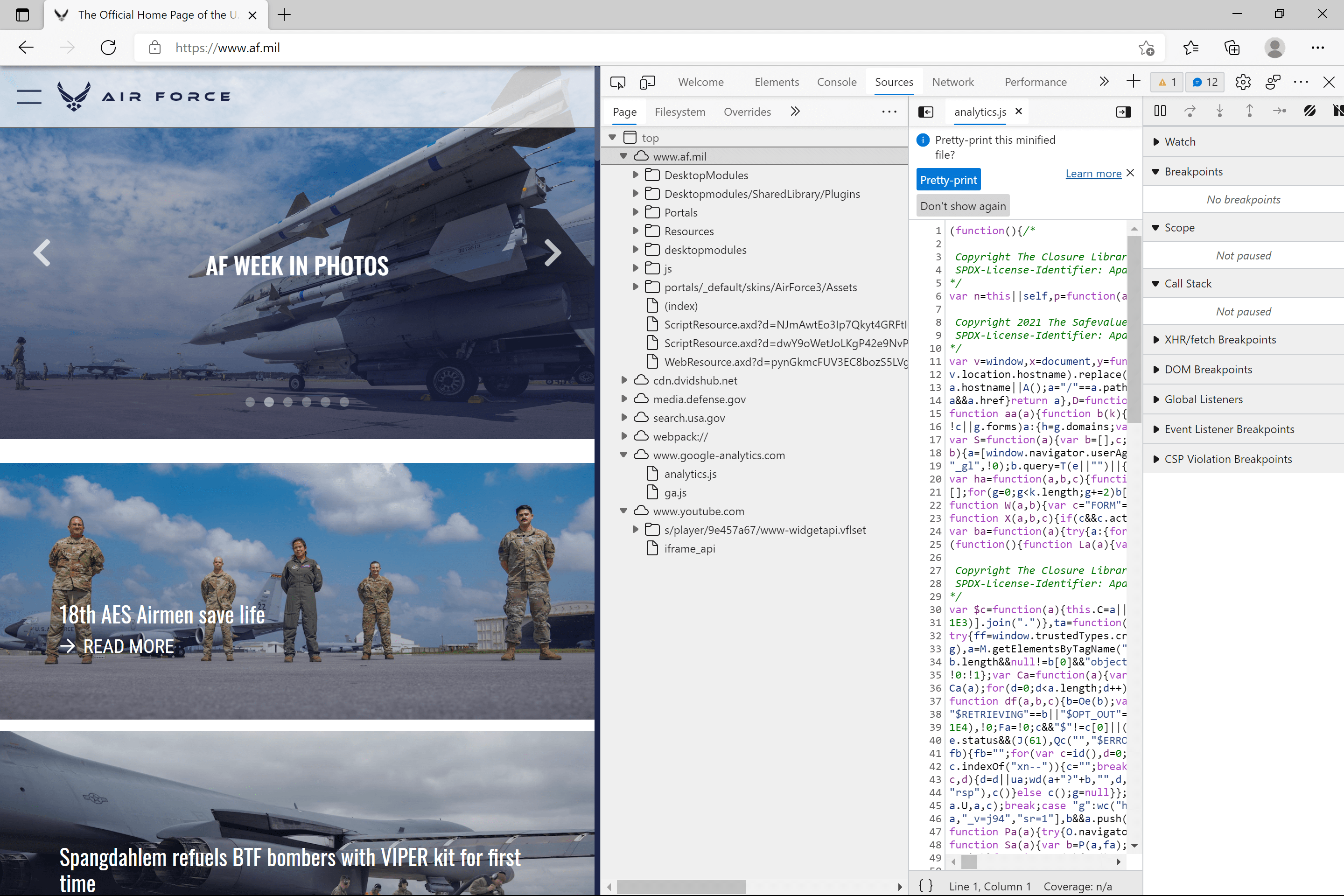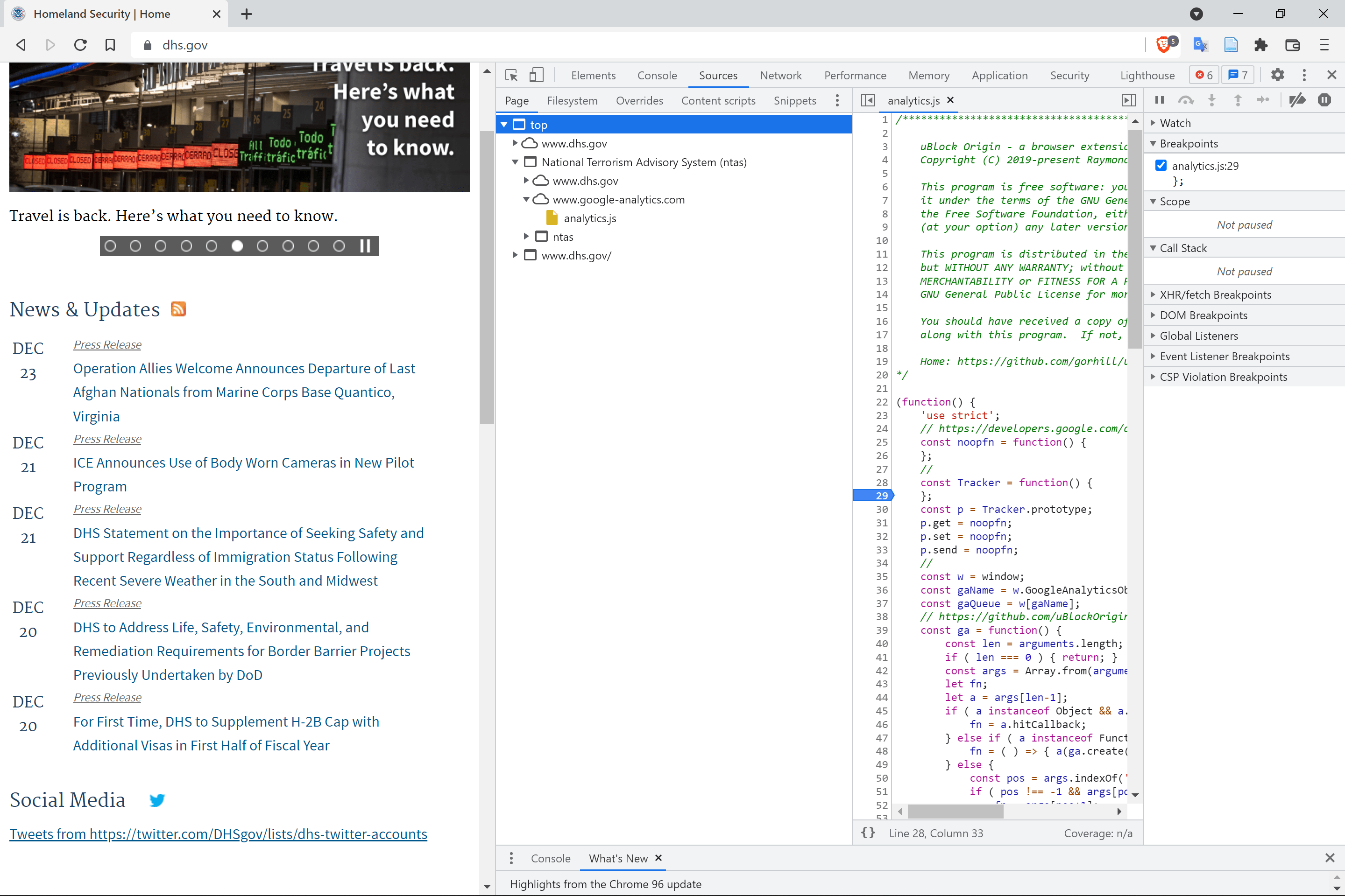 The presence of Google Analytics on a web page can be detected by sources located under google-analytics[.]com. or by presence of the file analytics.js under any Google domain, like doubleclick[.]net. One can determine when Google Analytics calls home by monitoring traffic to Google domains. Other files from Google domains can also serve as beacons. Some government websites also send data to Facebook, Twitter, Adobe, and less-known aggregators.