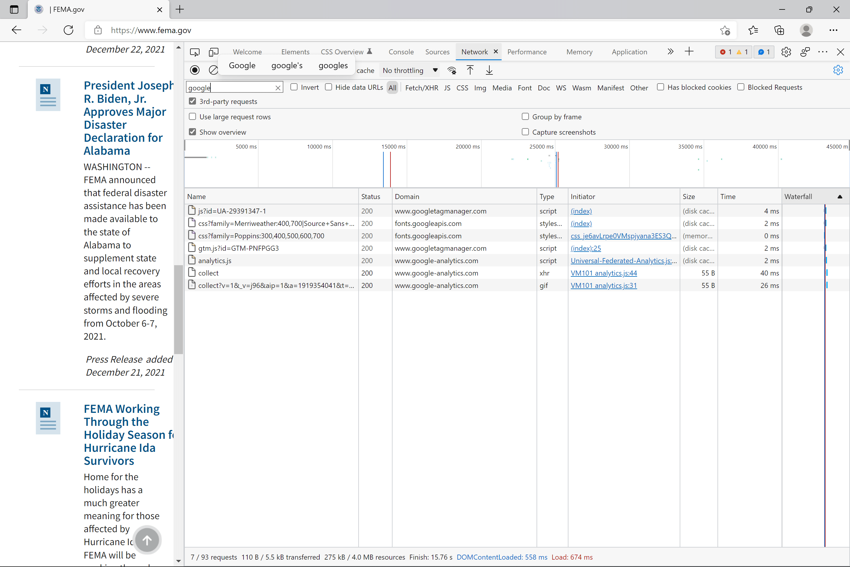 The following traffic logs and sources were collected using the Microsoft Edge browser in Texas on October 10, 2021, except where noted. In the Edge menu, this data can be found under More Tools > Developer Tools.