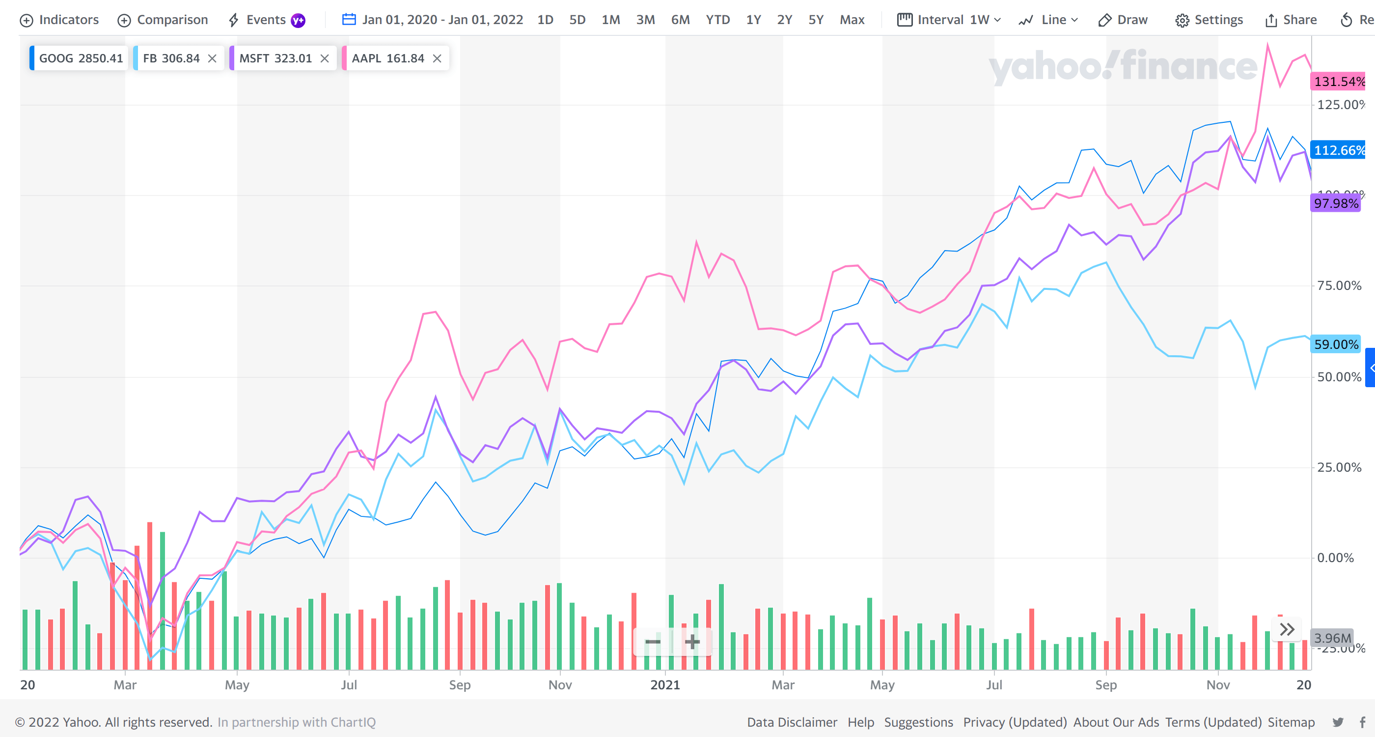 Figure 1. The market price increase of GOOG, FB, MSFT, and AAPL during the same time