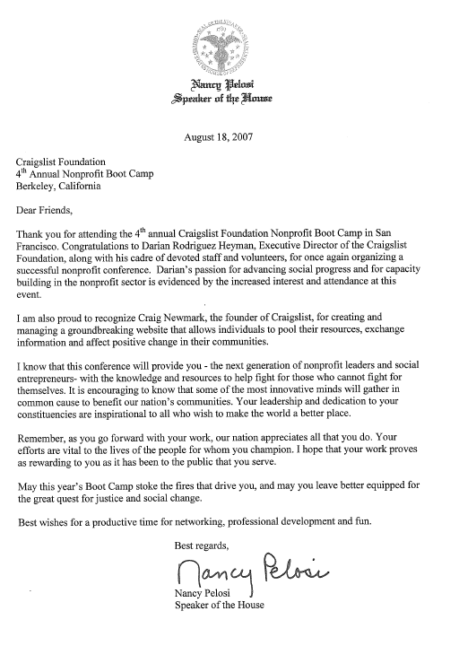 A letter from Nancy Pelosi to Craig Newmark, 2007
