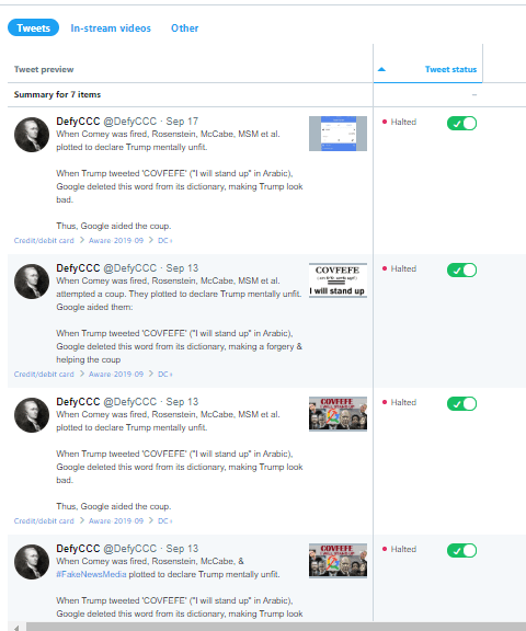Screenshot from the Twitter Ads Dashboard. A red dot next to the word Halted indicate promoted tweets, banned by Twitter for their content, usually after delivery has already started.