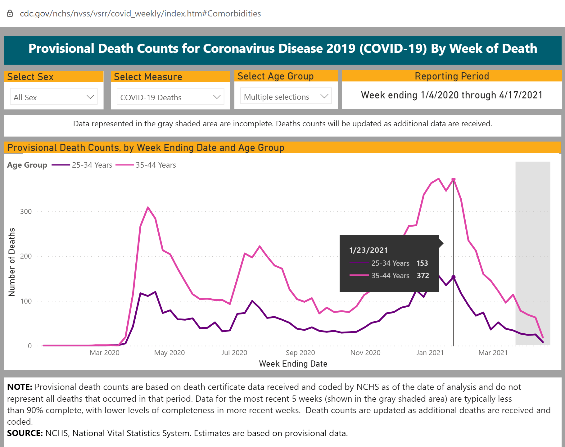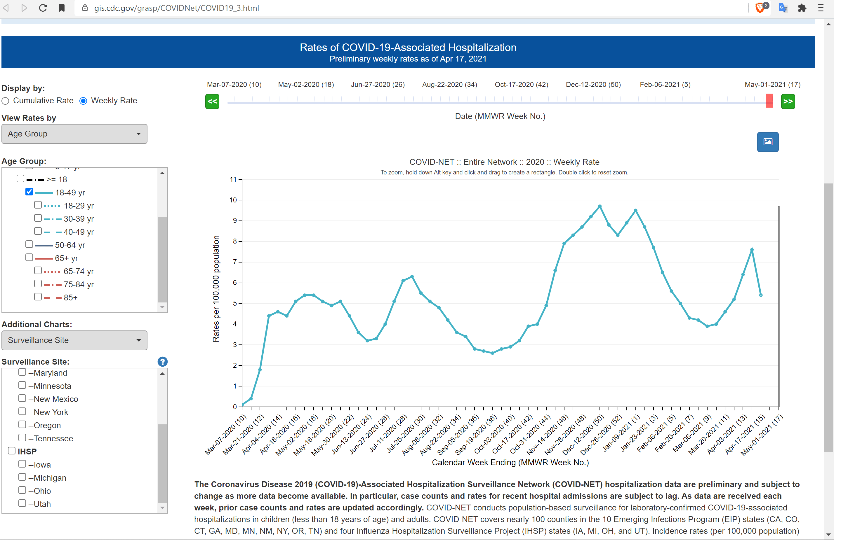 https://gis.cdc.gov/grasp/COVIDNet/COVID19_3.html Ages 18-49. The data is for a subset of states, including California and New York but excluding Texas and Florida. Notice the ominous peak on the week of April 10.